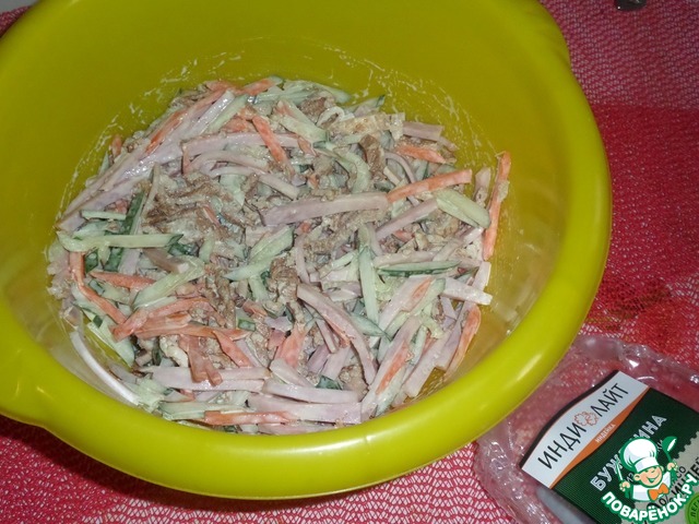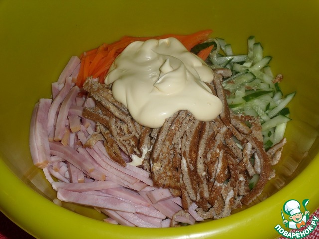 Выкладываем нарезанные ингредиенты в глубокую миску. Добавляем майонез и соль по вкусу.