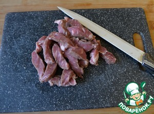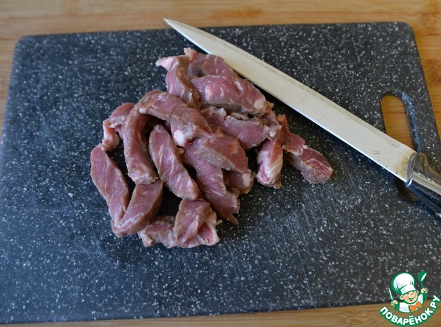 Параллельно с этим, моем говядину, можно брать баранину, обсушиваем салфеткой. Режем полосками или кубиками.