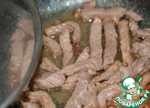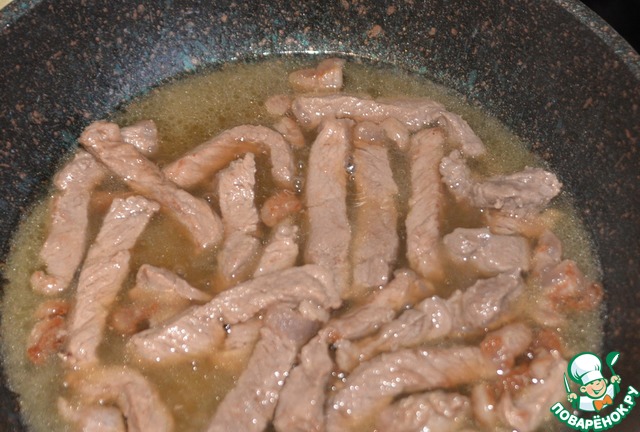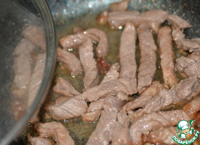 Наливаем стакан кипятка, убавляем огонь до среднего и тушим мясо 30 минут при закрытой крышке. К концу тушения вода должна испариться.