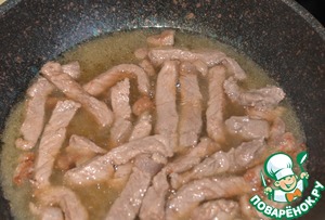 На горячую сковороду наливаем масло. В оригинальном рецепте используется казан. Я также порезала жир с говядины и вытопила. Кладём на горячую сковороду говядину. Обжариваем 5 минут, помешивая на сильном огне.