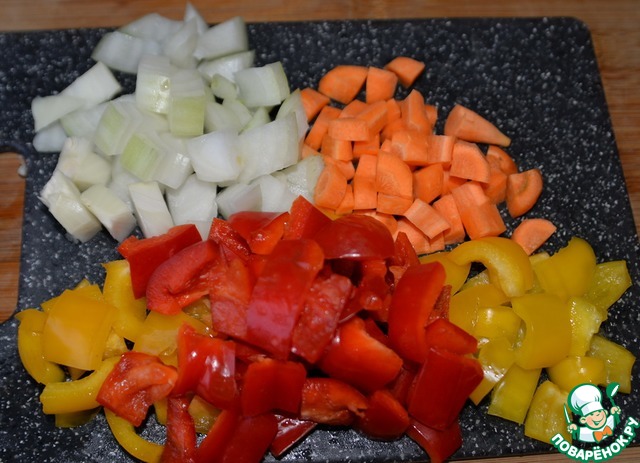 Овощи моем, чистим. Крупными кубиками режем лук, морковь, перец (у меня: красный и жёлтый).