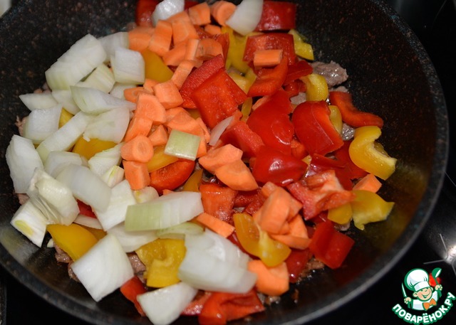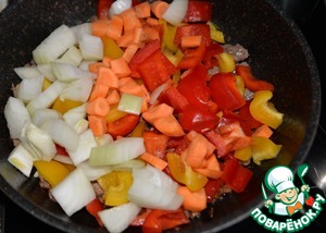 Кладём овощи к мясу, обжариваем сначала на сильном огне 1 минуту, далее на среднем 10 минут, помешивая.