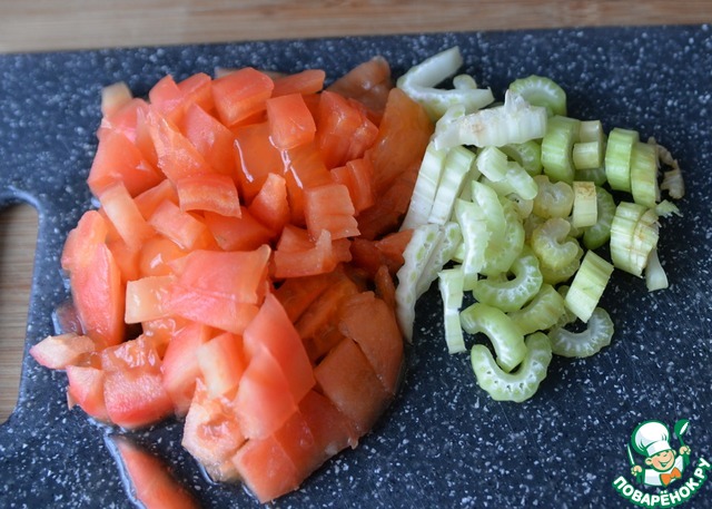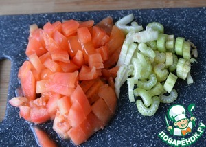 Ошпариваем помидоры, снимаем шкурку, режем кубиками. Сельдерей режем полосками.