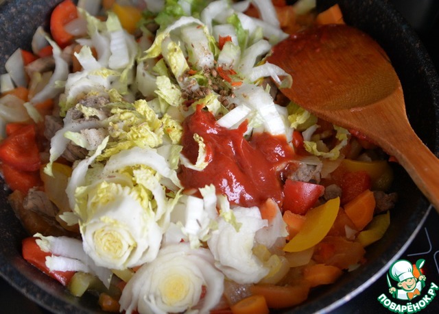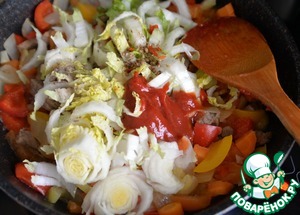 Кладём чеснок и пекинскую капусту на сковороду. Добавляем томатную пасту, кориандр, зиру, чёрный и жгучий красный перец. Я кориандр растолкла в ступке. Перемешиваем.