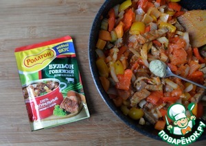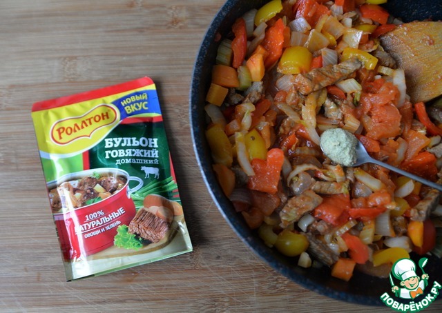 Далее необходимо добавить соль, я же вам советую положить Бульон Роллтон Говяжий домашний. Это, конечно, не по рецепту, но сделает блюдо более насыщеннее по вкусу и ароматнее.