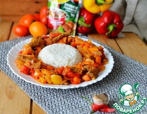 Вокруг риса кладём мясо с овощами. Подаём блюдо горячим, посыпав зеленью. У меня - кинза. Приятного аппетита!