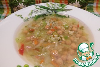 На сковороду наливаем масло, греем его и выкладываем лук, порезанный мелко. Золотим его и выкладываем натёртую морковь. Перемешиваем и убавляем огонь на минимум. Больше тушим, чем обжариваем, почти до готовности, под крышкой. Выкладываем перец болгарский тоже порезанный небольшим кубиком и перец чили, убрав у него семена и порезав его тонкой стружкой. С перцем чили щи получатся остренькие. Если есть будут дети или те, кто не ест острую пищу, то момент с острым перцем упустите. Тушим ещё пару минут. Банку с фасолью открываем и откидываем на дуршлаг, чтобы стекла жидкость. Отправляем в сковороду. Овощи тушим ещё минуты 3.