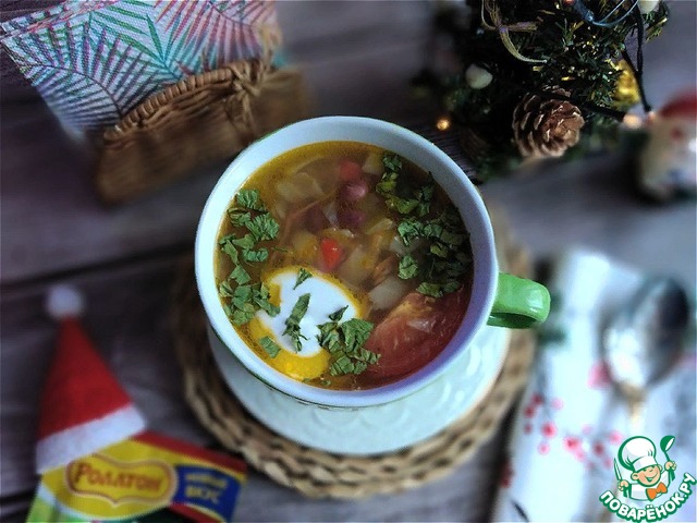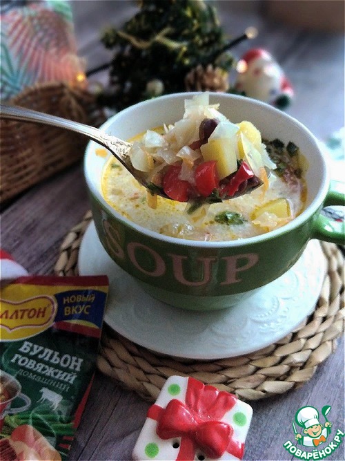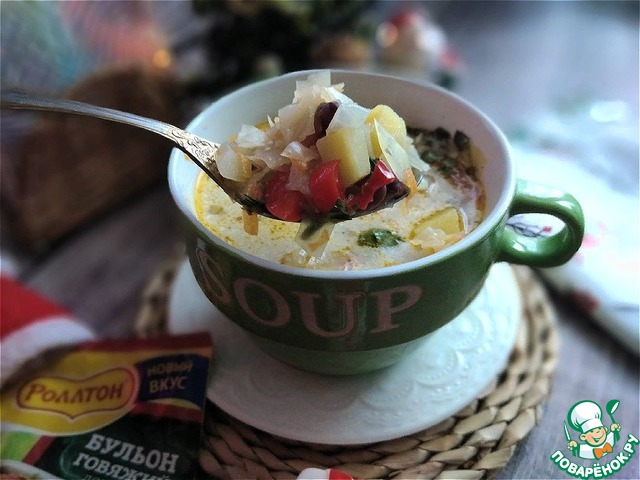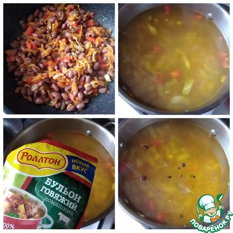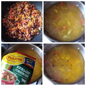 Заправка готова. Отправляем её в кастрюлю, где капуста и картофель уже сварились. Доводим до кипения и пробуем на вкус и достаточно ли солёно. Я добавила ещё 1 ст л бульона говяжьего домашнего Роллтон. Вкус меня устроил. Выкладываем перцы: чёрный и душистый горошком и продолжаем варить минуты 3-5 под крышкой на минимальном огне при слабом кирении.