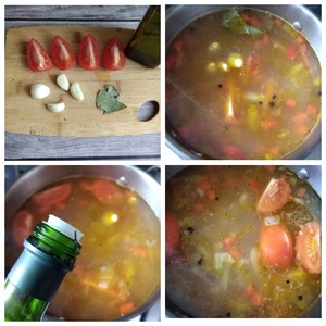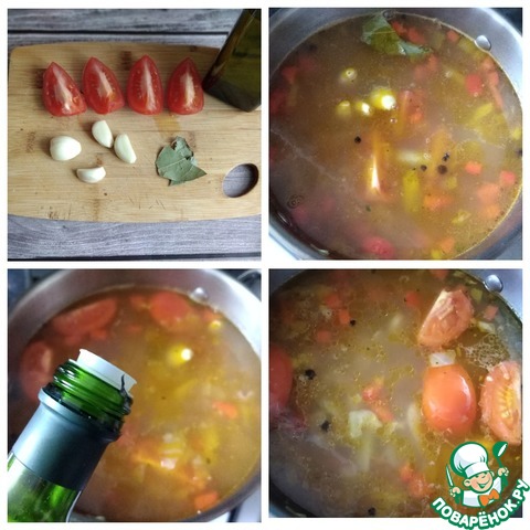Помидор нарезаем на крупные части, чеснок чистим и оставляем зубчиками. Отправляем в кастрюлю вместе с лавровым листом. Варим минуты 2. Наливаем оливковое масло нерафинированное и снимаем сразу с огня. Щи готовы! Даём щам настояться хотя бы немного.