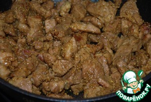 Когда жидкость на сковороде почти вся выкипит, добавить соль и специи и перемешивая все довести до полного испарения жидкости. Моя сковорода не требует добавления растительного масла. Если у Вас пристает ко дну мясо, то добавьте растительного масла. Выправите мясо на соль, перец.