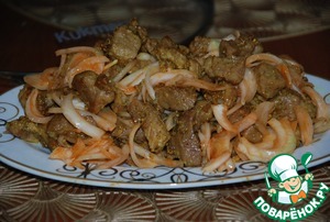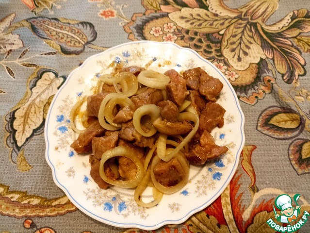 Нарезать мясо небольшими кусочками а-ля на гуляш. Выложить его в разогретую, смазанную растительным маслом сковороду. Залить мясо пивом. Количество пива зависит от диаметра Вашей сковороды. У меня ушло в районе 300 мл. Готовить мне помогла моя новая помощница сковорода "Granit ultra". В ней очень равномерный нагрев и готовится все гораздо быстрее. Это очень легко и все получится даже у начинающей хозяйки. Подобные рецепты просто идеальны для этой сковороды. После выпаривания лишней жидкости при обжарке ничего не пристает и не требуется дополнительно подливать растительное масло.