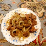 Перемешайте содержимое сковороды с маринованным луком и подавайте!