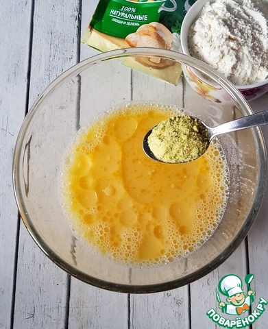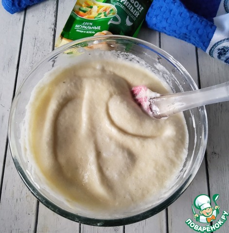 Для теста нужно отделить белки от желтков, белки взбить в крепкую пену. Желтки смешать с сывороткой (молоком), добавить масло и приправу
