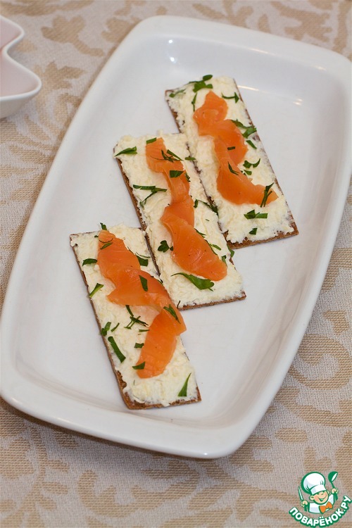 Приготовленной намазкой смазать хлебцы, выложить кусочки рыбы (лососевые или слабосоленую селедку).