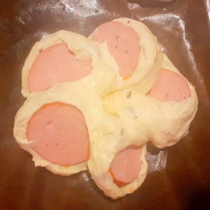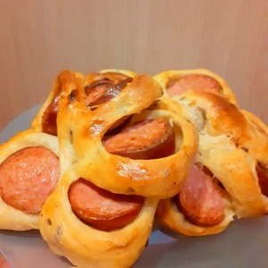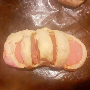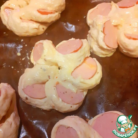 Из получившегося теста скатать 12 булочек. Каждую приплюснуть и, положив в нее сардельку, защипнуть как пирожок. Перевернуть "швом" вниз