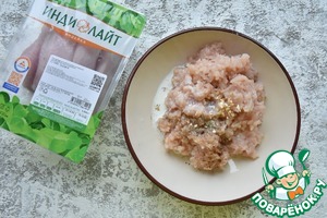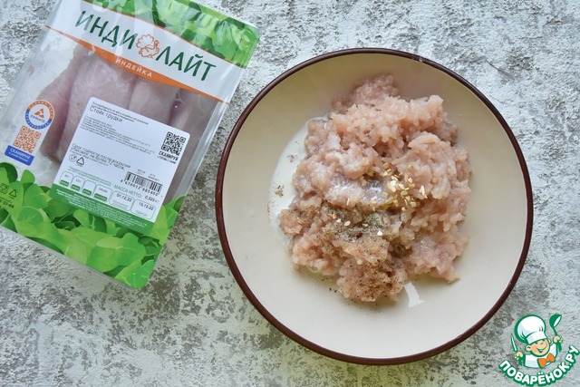 Фарш готовлю из грудки индейки "Индилайт". В перекрученное на мясорубке мясо добавляю сливки, соль, сухой чеснок, молотый перец и хорошенько вымешиваю фарш, чтобы он стал более вязким и липким.