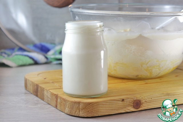 В чашку с яичной смесью просеять необходимое количество муки, предварительно смешанную с разрыхлителем.