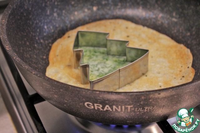 На блин (испеченную сторону) поставить форму - вырубку для печенья «ёлка» и осторожно заполнить её тестом с зеленью укропа толщиной не более 2 мм.