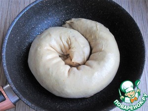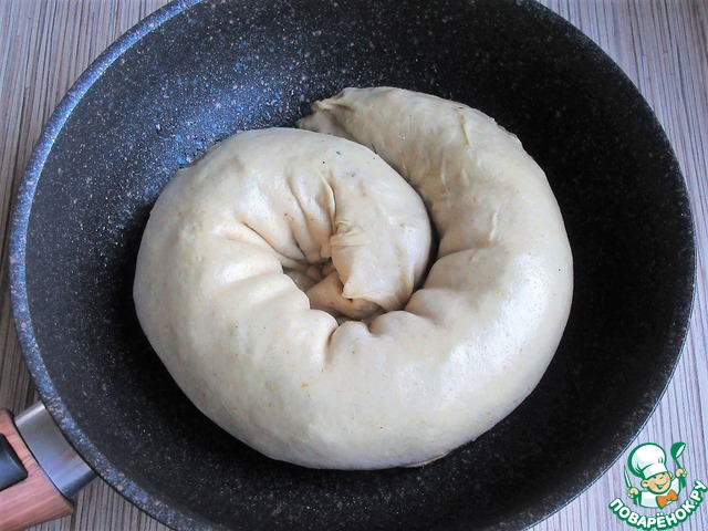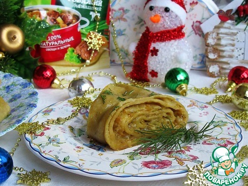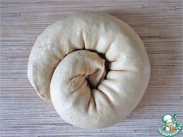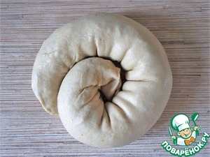 Свернуть неплотным рулетом, начиная с края с начинкой, затем завернуть неплотной улиткой.