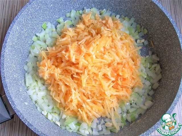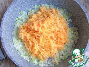 Лук и чеснок обжарить на растительном масле в большой сковороде. Добавить тертую тыкву, обжарить 5 минут.