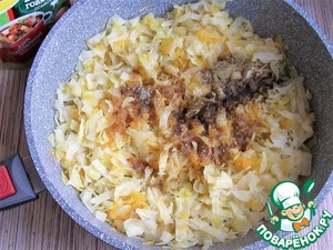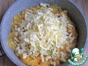Добавить нашинкованную капусту, обжарить 5 минут.