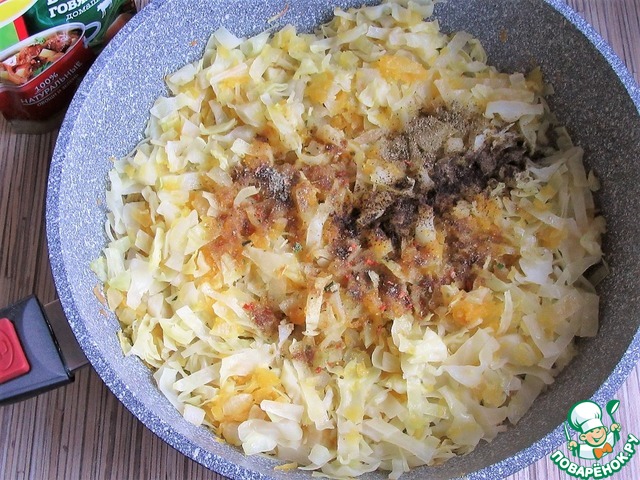 Добавить бульон и черный перец. Перемешать, тушить 10-15 минут до готовности капусты.