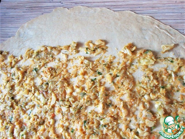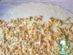 Выложить сверху начинку, с одного края отступая на 10 см.