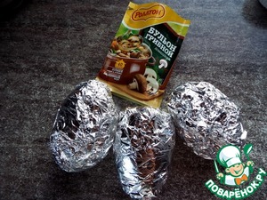 Картофель тщательно вымыть щёткой. Завернуть в фольгу и запекать при 190 градусах, до мягкости. Это можно проверить зубочисткой.