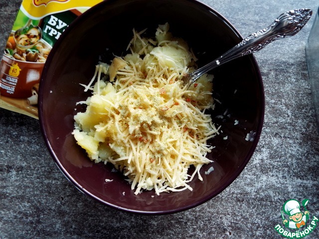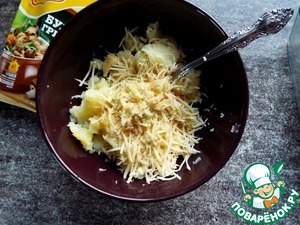 Картофельную мякоть нарезать или размять вилкой, добавить натёртый сыр, сухой бульон и сметану. -