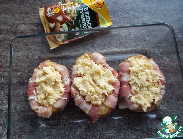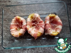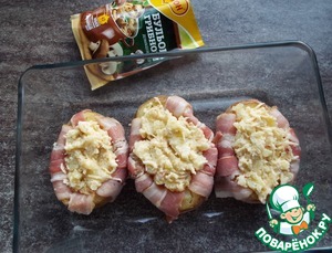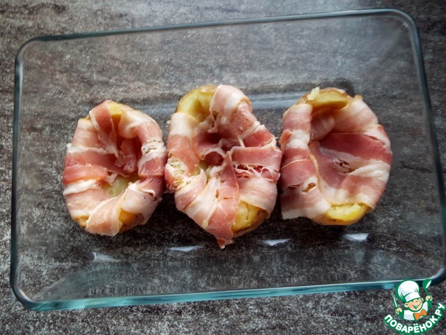 Картофельные лодочки обернуть беконом и выложить в форму для запекания.