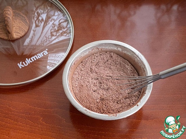 В миске смешайте все сухие ингредиенты : муку, крахмал, какао-порошок, ванилин и разрыхлитель.