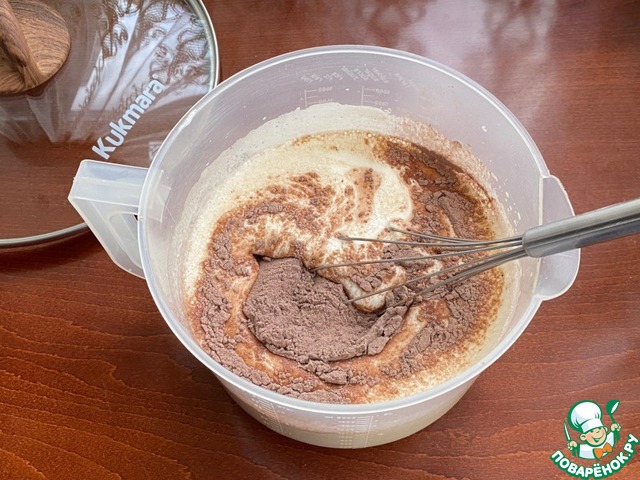 В массу всыпьте половину сухих ингредиентов и снова все перемешайте венчиком.