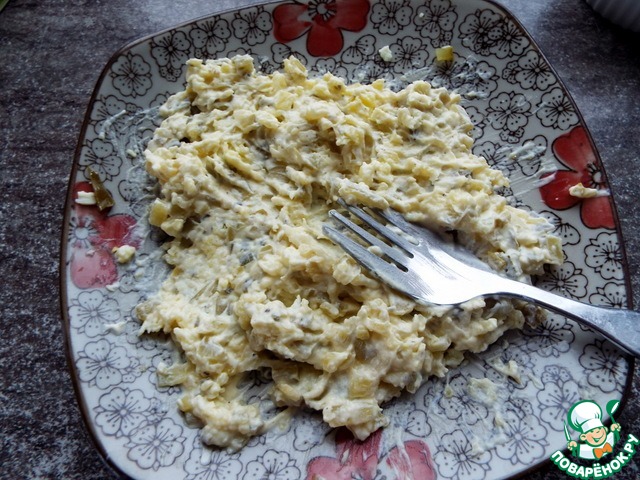 Желтки размять вилкой, добавить к ним огурец, чеснок и майонез.