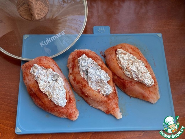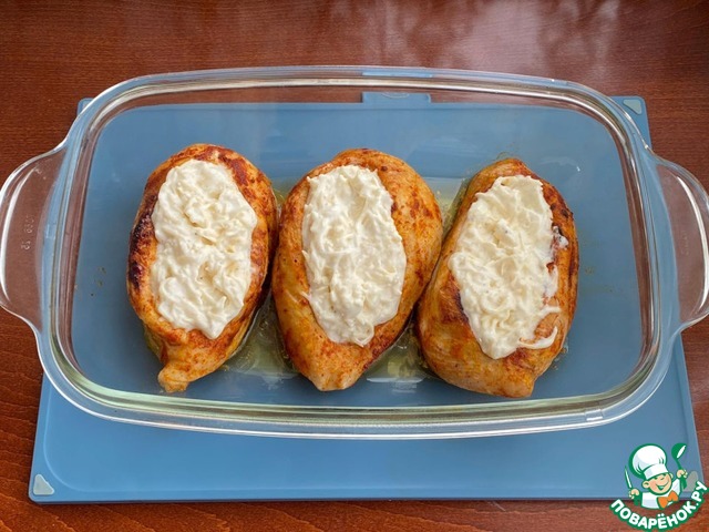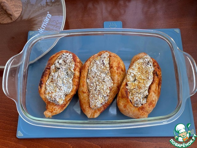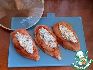 Куриные грудки к этому времени уже будут готовы. Удалите фольгу и нафаршируйте белково- сырной массой.