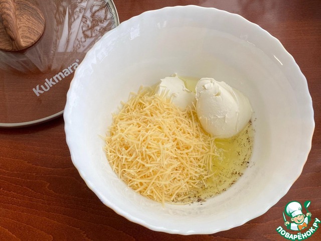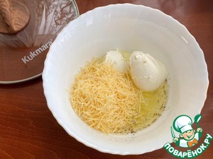 Затем к белкам добавьте сливочный сыр и пармезан, натертый на мелкой терке. Все перемешайте.