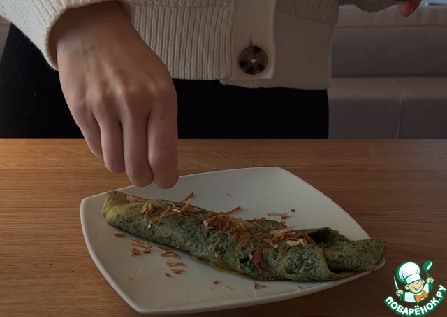 Выложить омлет на тарелку в форме трубочки, сбрызнуть оливковым маслом и украсить молотым перцем и жареным луком. Можно подавать!