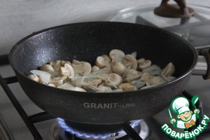 На сковороде на небольшом огне разогреть необходимое количество растительного масло, добавить полукольца репчатого лука и грибы, перемешать и жарить в течение 5-10 минут, иногда помешивая.