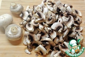 Гриьы разрезать пополам, затем нарезать пластинками.