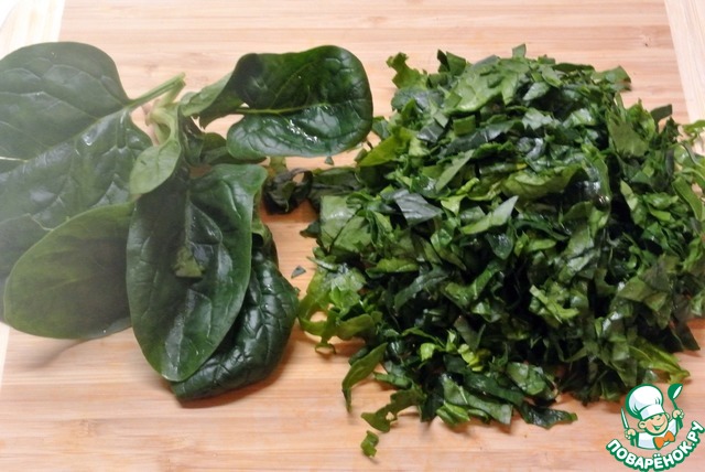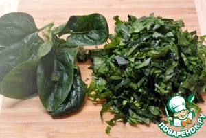 Шпинат хорошо промыть, обсушить, удалить стебли. Листья нарезать соломкой.