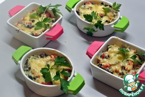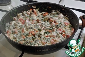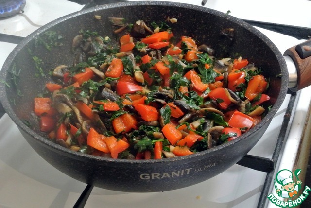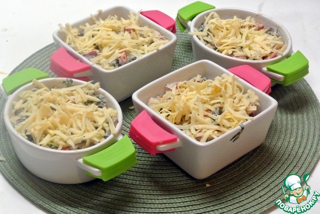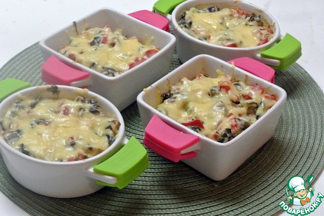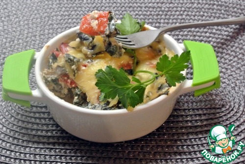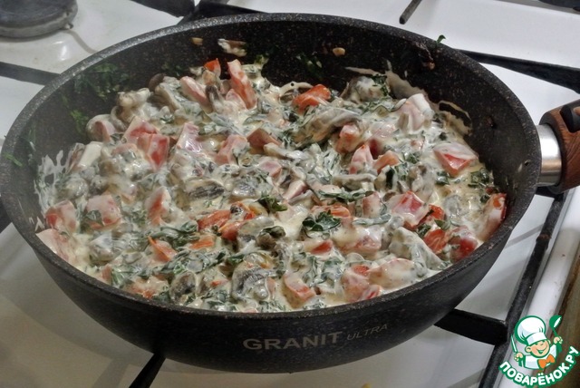 Жюлье́н (от фр. julienne) — сложная горячая закуска, приготовленная преимущественно из птицы или дичи и грибов, тонко нарезанных одноимённым способом — соломкой, а затем запечённых в кокотнице со сметаной или соусом под тёртым сыром. Популярное блюдо советской ресторанной кухни. Я приготовила жюльен со шпинатом и болгарским перцем. Интересное сочетание продуктов. В приготовлении мне помогала сковорода 24 см со съемной ручкой, стеклянной крышкой, АП линия "Granit ultra" ТМ KUKMARA.