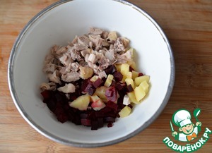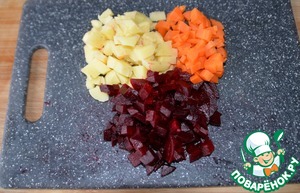 Чистим вареные: картофель, морковь и свеклу, режем кубиками.