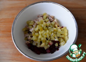 Кубиками режем маринованные огурцы, советую их для вкуса класть больше.