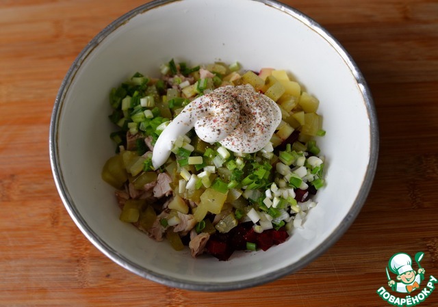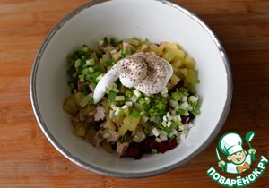 Добавляем рубленный зелёный лук, соль, смесь перцев, майонез. Майонез можно пополам со сметаной. Перемешиваем.