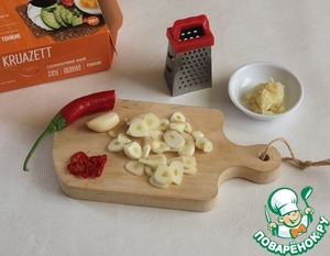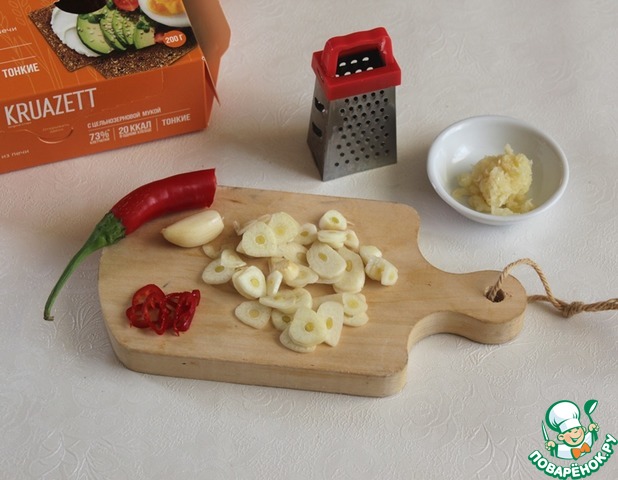 Растолките 4 зубчика чеснока или натрите на мелкой терке. Остальной чеснок тонко нарежьте. Мелко нарежьте перец чили.