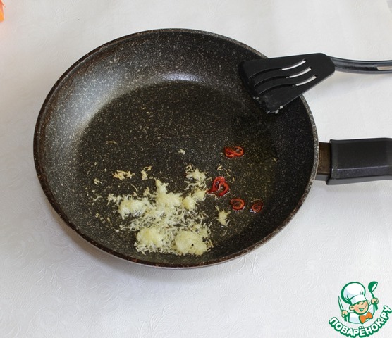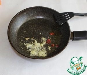 В большой сковороде разогрейте оливковое масло, добавьте толченый чеснок и нарезанный чили. Помешивая, держите на огне 10 секунд.