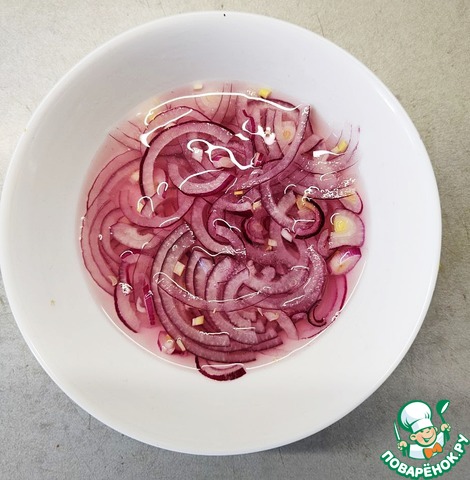 Лук нарезать полукольцами. Замариновать с уксусом, солью и сахаром в небольшом количестве воды. Достаточно минут 20.