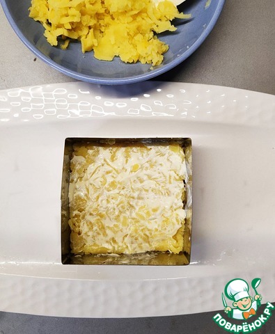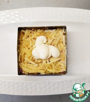 Салат выкладывается слоями. Можно в салатнике. А можно порционно в бокалах или в форме. Первым слоем идет натертый картофель. Слегка смазать майонезом.