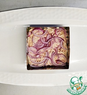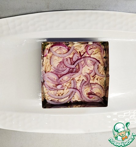 Дальше выкладываем печень трески и лук. Этот слой без майонеза.