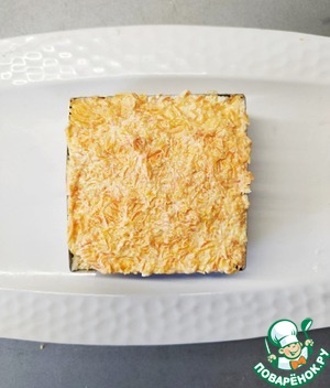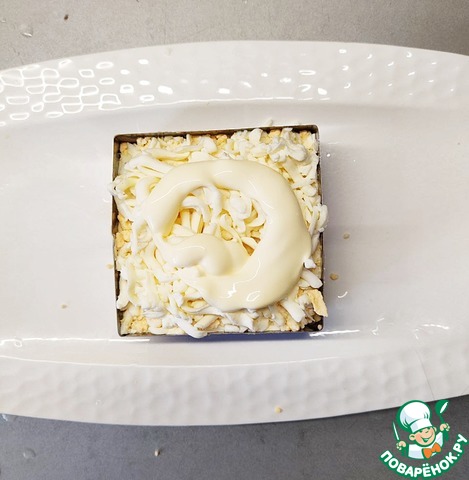 И натертую морковь. Можно без майонеза. Даже лучше будет. Красивее.