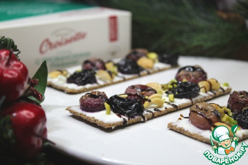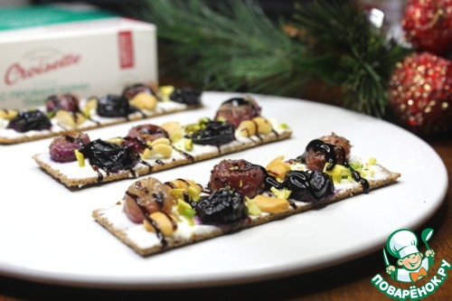 Еще одна вкусная и быстрая закуска на хрустящих хлебцах. Виноград можно запечь заранее. Пикантная и очень интересная на вкус, она украсит праздничный стол. Пробуем?